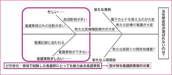 はじめに、「なぜ急性期病院が選ばれないか」について、特性要因図を用い分析した結果、「忙しい」ことや、「新たな業務(電子カルテなど)」「新たな人間関係」などへの抵抗があげられました(図1)。